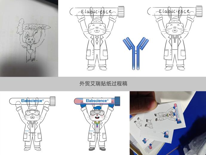之前外贸同事想做一款艾瑞的贴纸,她当时给了我一张手绘的粗略草图,是艾瑞举着一根胡萝卜的图案,我当时看到草图第一直觉是艾瑞举着一根试剂管。于是我立马跟她沟通草图内容,并一一跟对方确认细节,她听到我的理解后,认可了试剂管更贴合形象特征的想法,最终把胡萝卜的设想改成了试剂管的创意。后面在讨论艾瑞领带细节的时候,也从误解的“DNA”造型升级为更贴切的抗体对造型。在整个任务执行过程中,确认内容、画出草图、上色,每一步完工后我都细致地和对方确认细节,最终实现了双方满意的结果。对我们生物行业的设计师来说,草图线稿的反复沟通其实是在“打地基”——看似耗时间,实则是用最小成本避免后期“塌楼”。一步错可能就会影响信息的准确性,甚至误导用户,所以这个过程的意义远超“确认好不好看”。