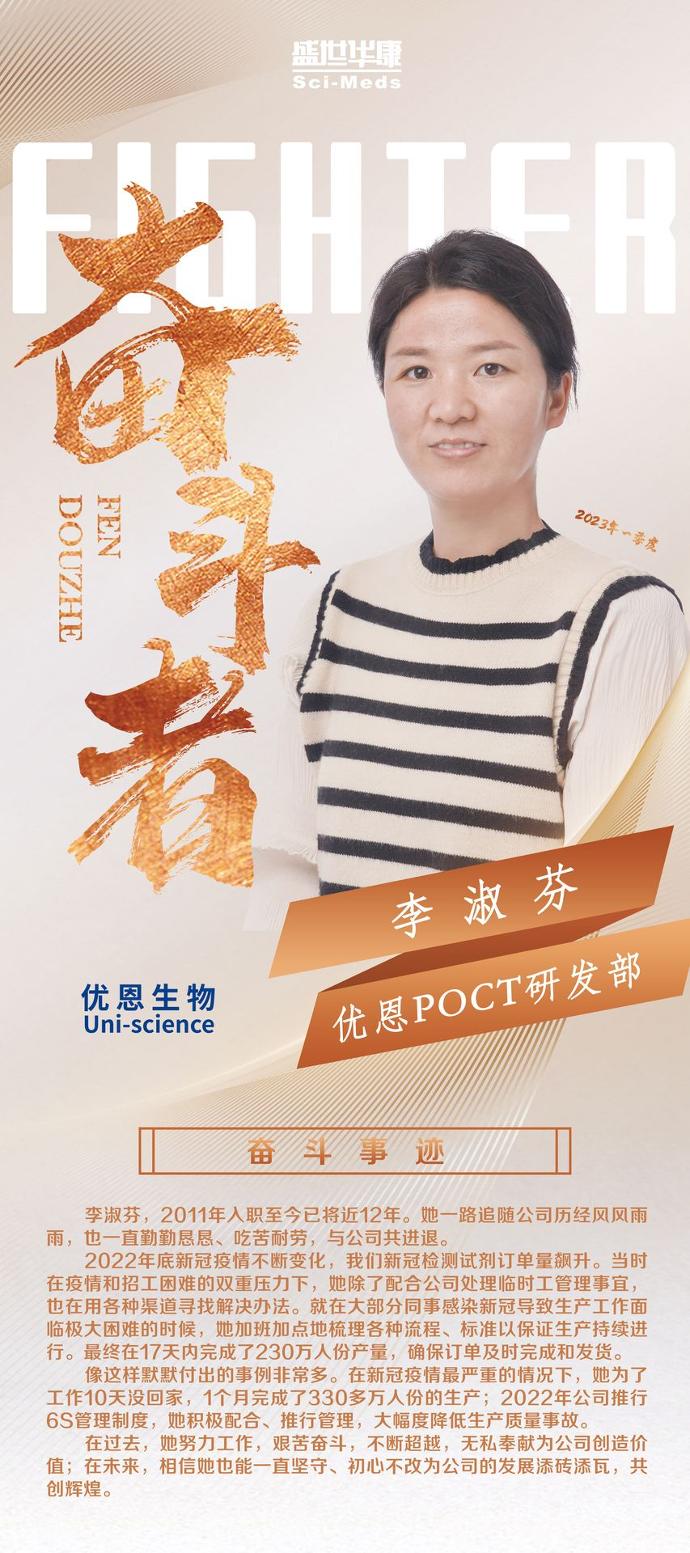 大家好!我是优恩POCT事业部的李淑芬。很感谢王耀同学的提名和各位评委对我工作的认可。年会上的“杰出贡献奖”已是莫大的褒奖,没想到还能荣获“奋斗者”这个意义重大的奖项,让我再次心潮澎湃,激动不已。