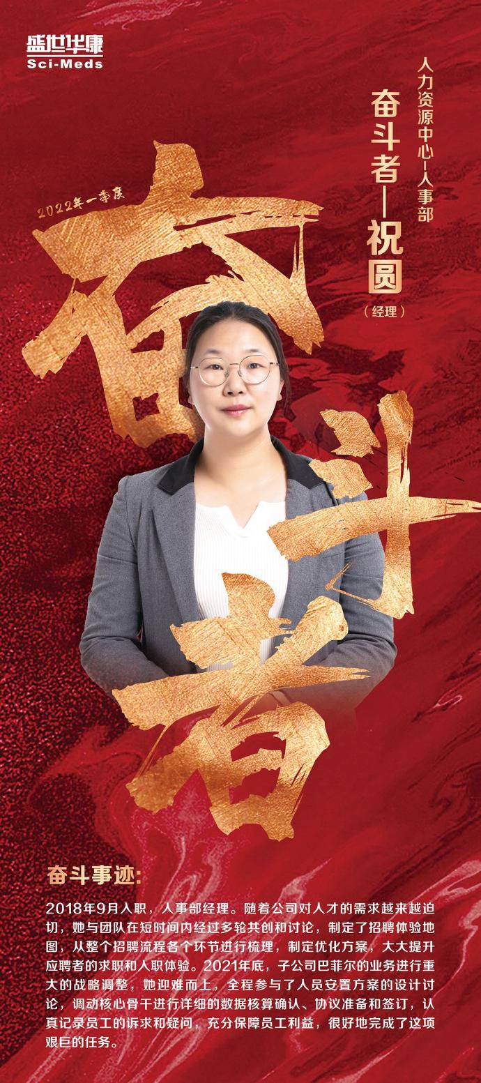 理,让每一个愿意留下来的同事都能找到一个满意的岗位。第一季度是一年当中最忙的时候,而且中间还有一个春节,但就是在这么短的时间内完成了这些工作,整体上进行地非常顺利。 在这件事里,祝圆充分体现了她甘于奉献、不怕困难、敢于面对挑战的品质,很好地完成了这项艰巨的工作。越是这样重大的事件,越是这样艰难的挑战,越能体现一个人的品质和能力,拥有这样品质和能力的人就是我们心目中的奋斗者!