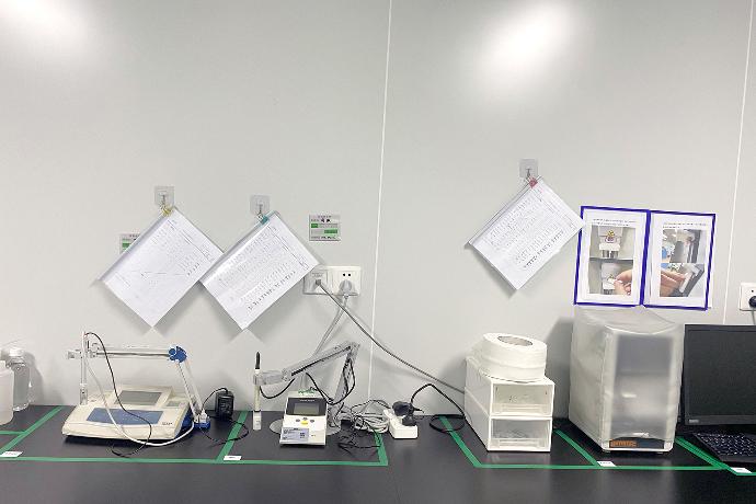 接下来我们一起走进普诺赛实验室,你会闻到84消毒液或是新洁尔灭亦或是臭氧特有的“清新”,瞬间提神醒脑。最先映入眼帘的是排列整齐的生产设备与检验设备,还有窗明几净的操作台与标识清晰的6S管理。设备维护记录本上密密麻麻的签名记载着普诺赛无数个脚踏实地的岁月,实验服按工序分区存放。这些看似繁琐却又细小的细节,实则是对客户交付的每一滴试剂、每一株细胞的郑重承诺。